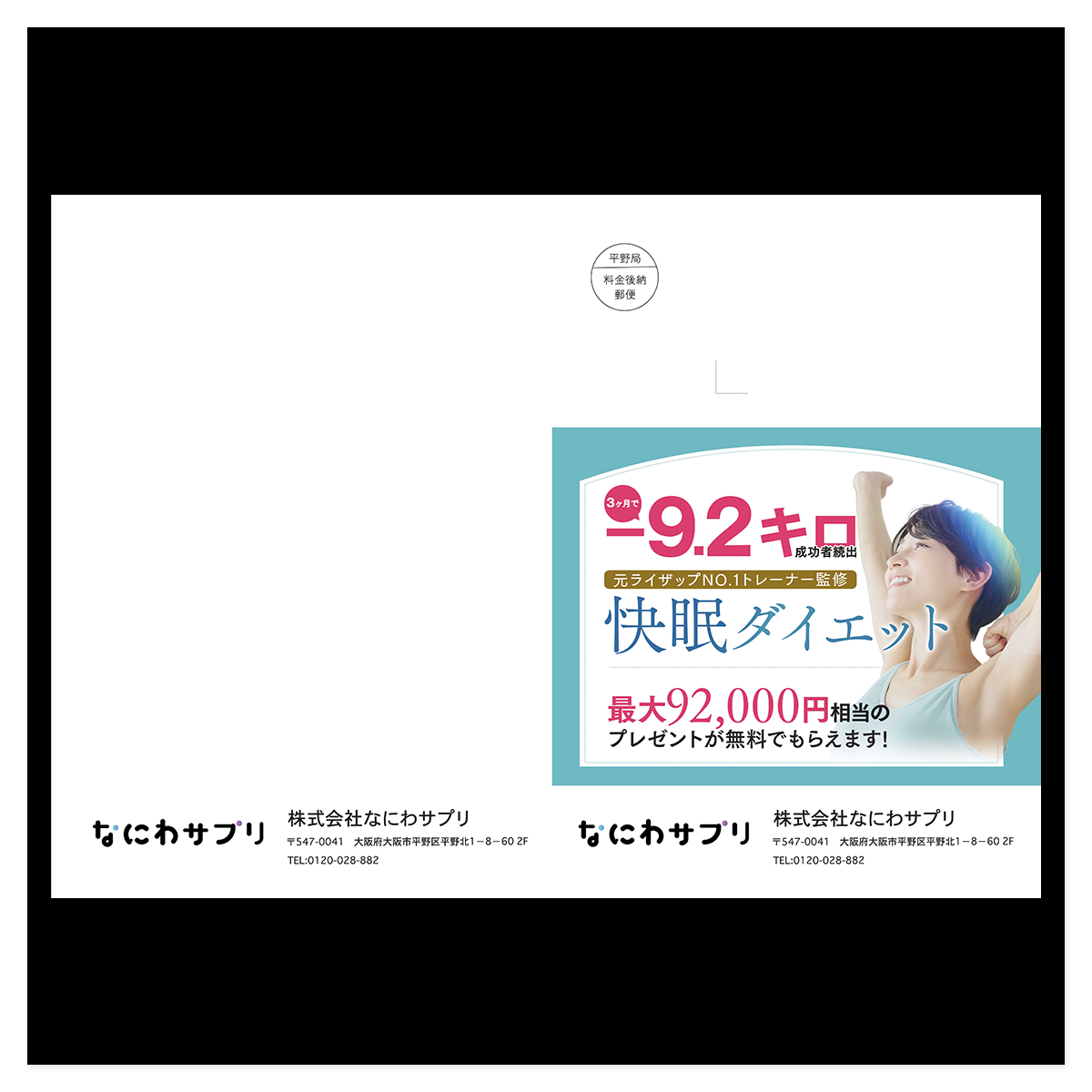 ダイエットの広告DM宛名面です。宛名をみて開いていただけるよう、魅せたいコピーが伝わる様にデザインしています。