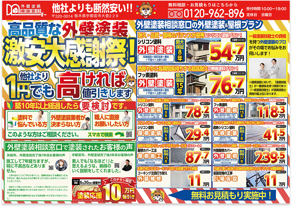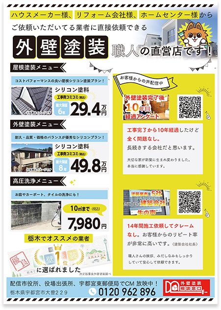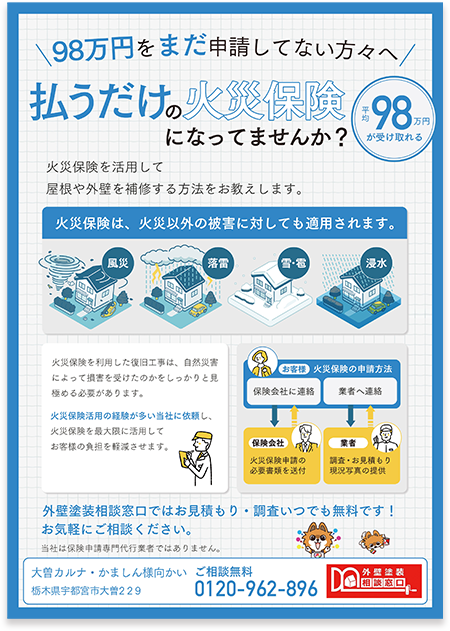 火災保険を利用した外壁塗装のサービス紹介ちらしです。青ベースで安心感の伝わるようデザインしています。