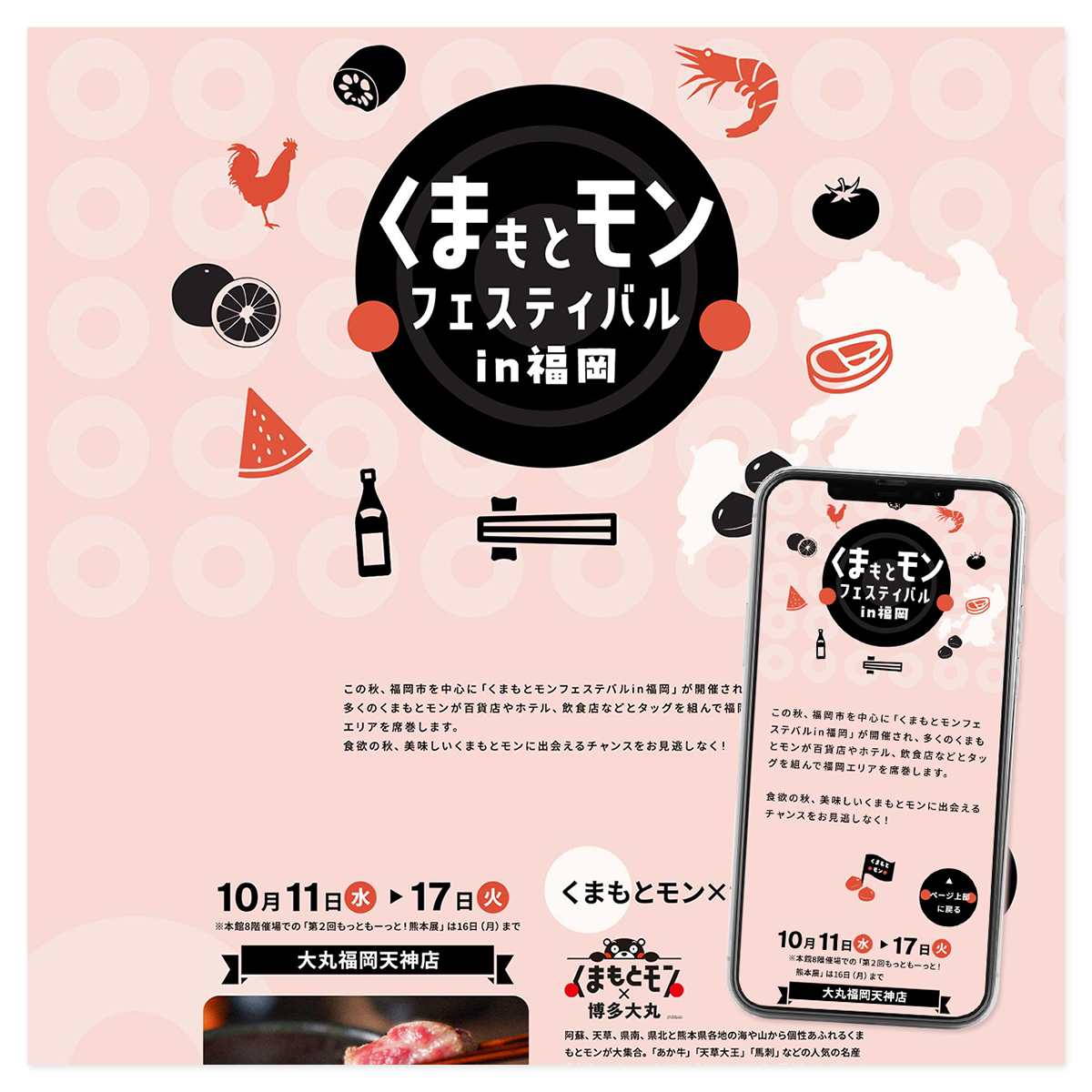 ターゲットの年齢層が少し高め(30代〜)なので落ち着いた雰囲気、またくまモンらしさな要素もいれかわいい、楽しそうな様子が伝わるようデザインしました。