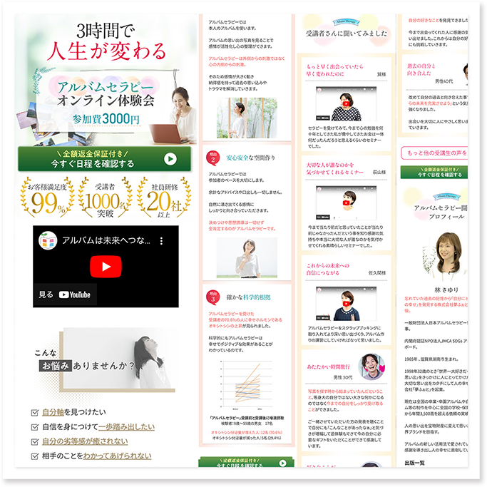 自分に自信がない30代〜40代女性がターゲットです。アルバムセラピーという内容から繊細で明るい雰囲気、女性が交換を持てるようデザインしています。