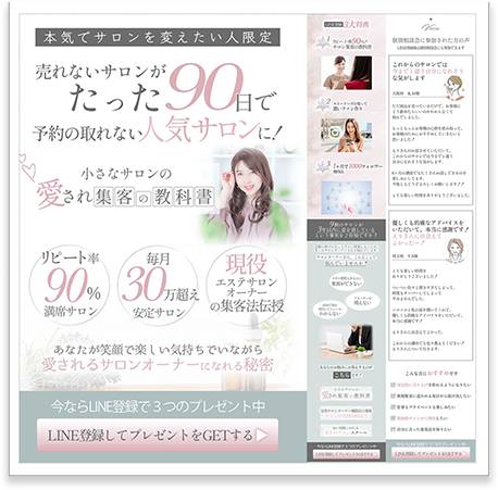 エステサロンコンサルのオプトインLPです。個人経営の女性エステサロンオーナー向けにデザインしています。