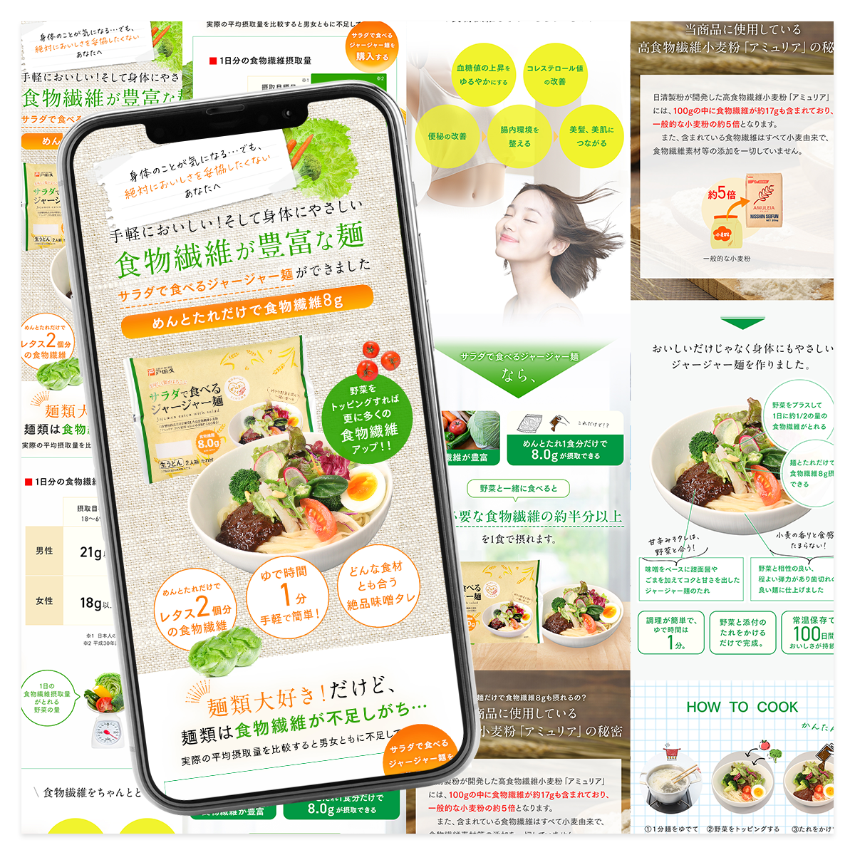 新商品発売のためPRのためのランディングページ制作いたしました。女性向けの健康を意識した商品であるため野菜の緑が映えそうなオレンジカラーをメインで制作いたしました。